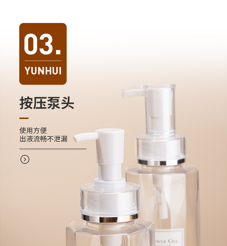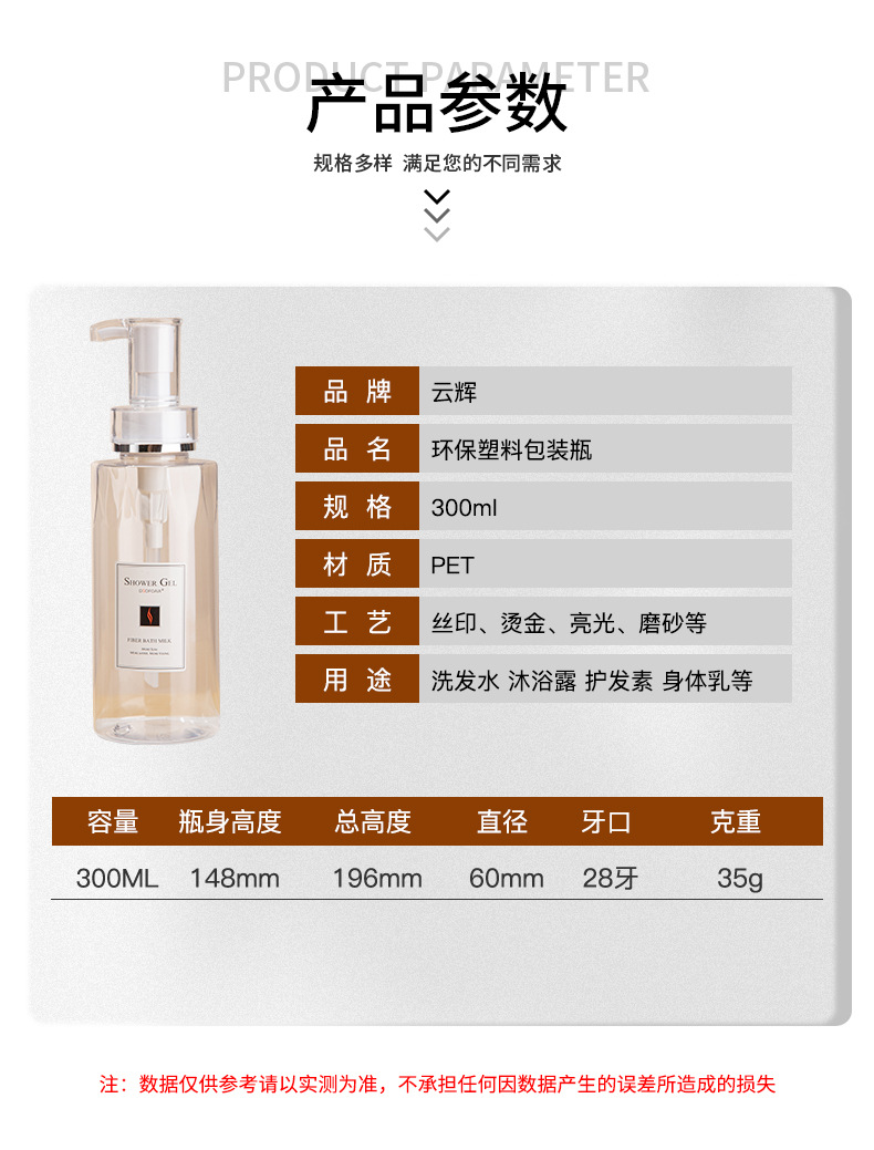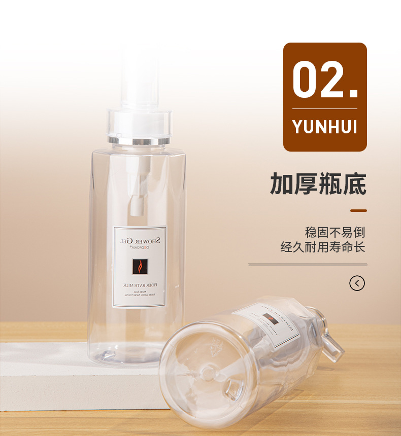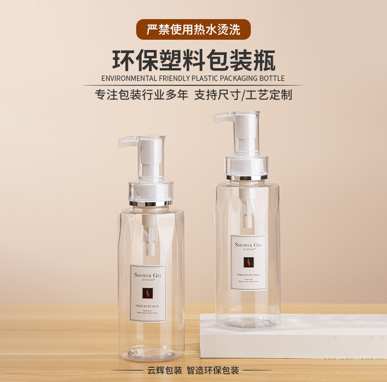 • 現(xiàn)貨300ml乳液按壓瓶 沐浴露瓶洗發(fā)水分裝瓶pet化妝品包材批發(fā),適用洗發(fā)水、沐浴露、護發(fā)素、身體乳、洗衣液等。
