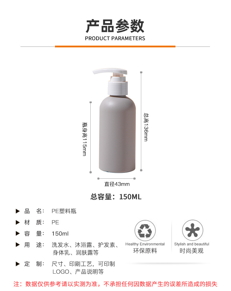 • 工廠直供沐浴露分裝瓶150ml乳液分裝瓶洗發(fā)水瓶子塑料洗護包材,適用洗發(fā)水、沐浴露、護發(fā)素、身體乳、洗衣液等。