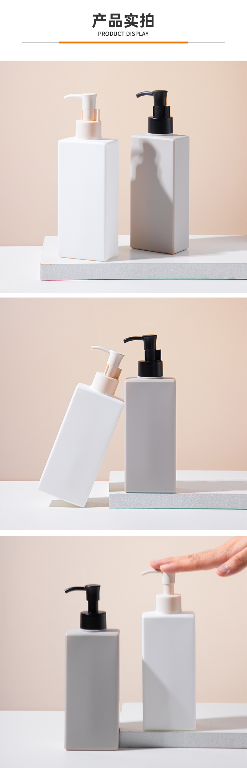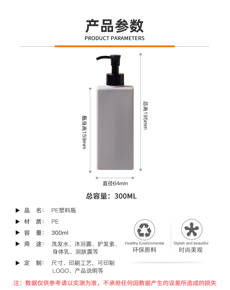 • 現(xiàn)貨PE扁方形塑料瓶包材酒店乳液瓶300ml洗發(fā)水瓶沐浴露瓶子,適用洗發(fā)水、沐浴露、護(hù)發(fā)素、身體乳、洗衣液等。